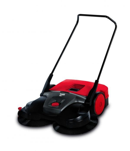 is a manual, gear-driven sweeping machine built for both indoor and outdoor hard surface cleaning