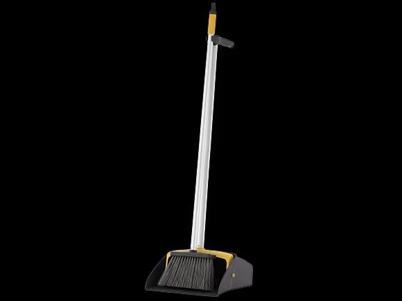 • It features an upright dustpan with a self-closing lid to trap dust and debris, along with a long-handled broom for ergonomic sweeping