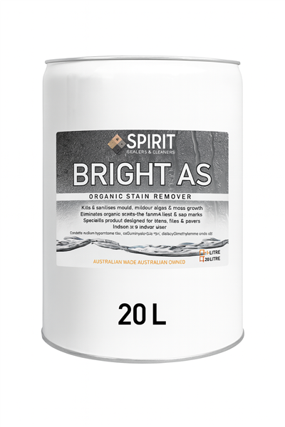 Bright As is a concentrated, chlorinated cleaner and organic stain remover formulated for interior and exterior use