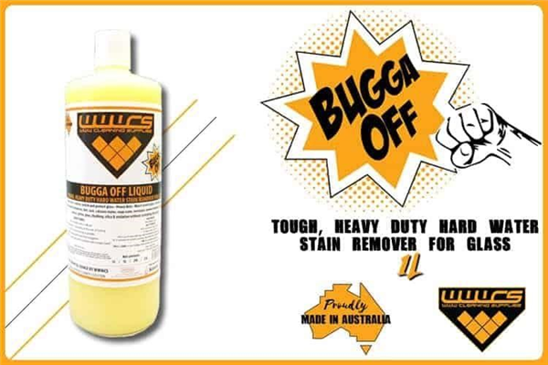 WWWCS Bugga Off is a tough, heavy-duty liquid stain remover formulated for glass surfaces and hard water stains