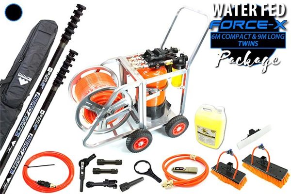 Premium “Twins Package” featuring two 100% carbon Force-X poles (6 m + 9 m) with dual DI outlets and bypass outlet for maximum flexibility