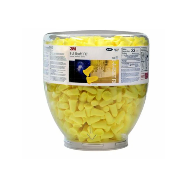 The 3M E-A-R Soft FX Dispenser Refill (500 earplugs per bottle) is a high-volume refill solution designed for use with the 3M E-A-R One Touch Pro Earplug Dispenser.