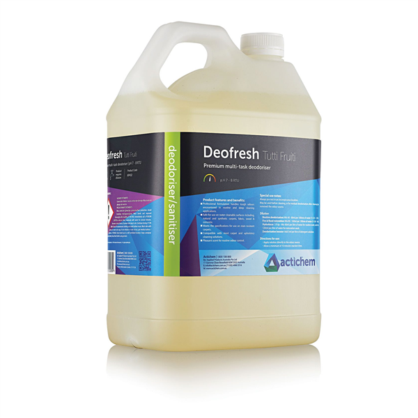 Actichem Deofresh Tutti Frutti is a professional carpet deodoriser and fragrance booster that neutralises persistent malodours while delivering a pleasant tutti-frutti scent