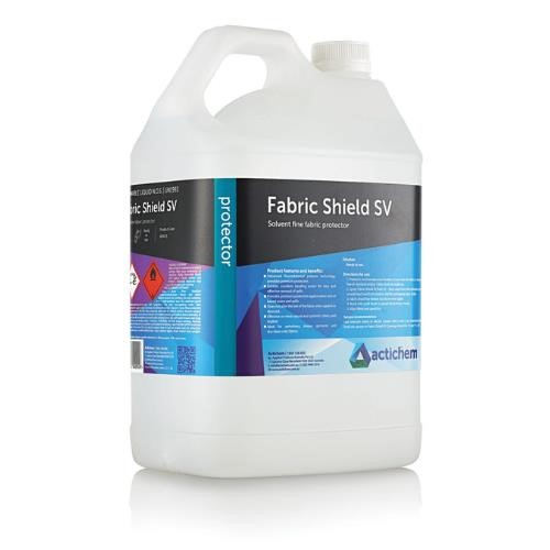 PRODUCT DESCRIPTION. Fabric Shield SV 5L is a high-performance, solvent-based fabric protector developed with advanced fluorochemical polymer technology to provide premium, long-lasting resistance against spills, stains, and everyday soiling. Specially formulated for moisture-sensitive and delicate fabrics, this fast-drying solution creates an invisible protective barrier that repels both water- and oil-based contaminants before they can penetrate the fibres. Fabric Shield SV 5L is ideal for professional use on fine upholstery, rugs, drapery, and automotive interiors, delivering effective protection without altering the fabric’s appearance or feel—making it a trusted choice in high-end residential and commercial environments