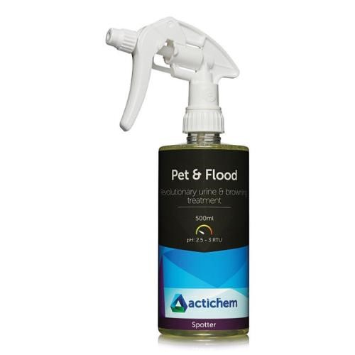 • Actichem Pet & Flood is a unique, low-pH spotting solution designed for high-performance removal of cellulosic browning, urine stains, and their associated odours.
