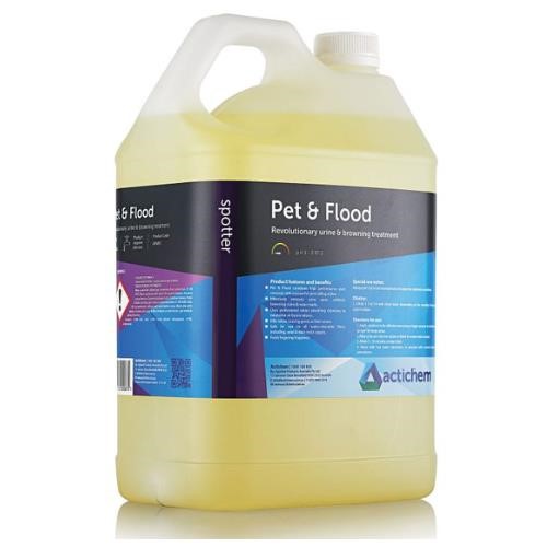 • Actichem Pet & Flood is a unique, low-pH spotting solution designed for high-performance removal of cellulosic browning, urine stains, and their associated odours