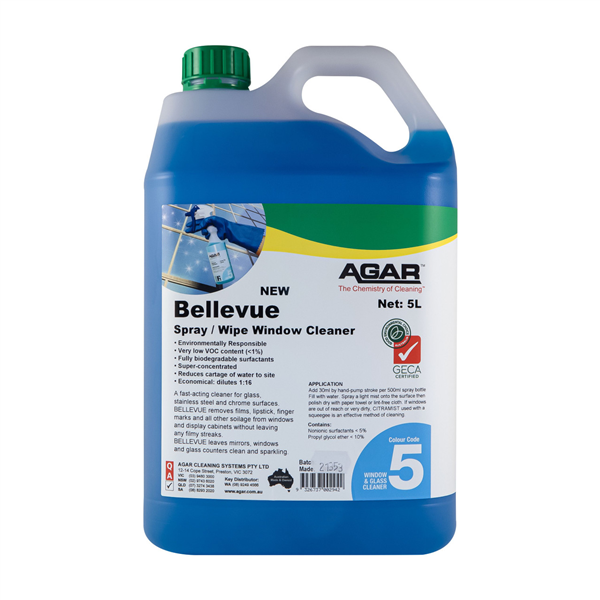 Agar Bellevue Spray & Wipe Window Cleaner 5L is a versatile, fast-acting cleaner designed for use on glass, mirrors, stainless steel, tiles, and washable hard surfaces