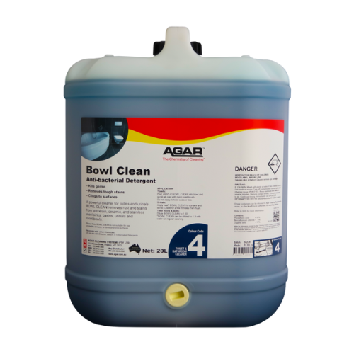 The Agar Bowl Clean is a high-strength antibacterial toilet and urinal cleaner formulated to dissolve water-marks, scale, rust, stains and organic deposits from washroom fixtures.