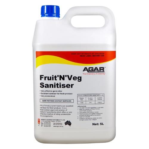 . is a food-contact approved solution of sodium hypochlorite in water with an available chlorine content of 5% when packed. Because it offers a very effective method of killing undesirable micro-organisms (germs, bacteria, etc.), FRUIT’N’VEG SANITISER is an excellent sanitiser for fresh produce.