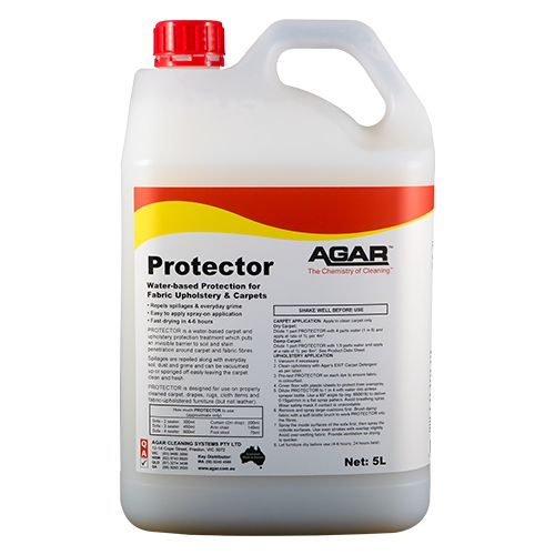Agar Protector 5L is a high-quality, water-based fabric and carpet treatment that forms a protective barrier against stains, spills, and grime. Designed to extend the life of carpets, rugs, and upholstery, this invisible coating repels water, oil, and soil without altering the colour or feel of the fabric. Ideal for homes, offices, hospitality venues, and commercial environments, Protector is non-toxic, low-odour, and fast-drying for quick, safe application