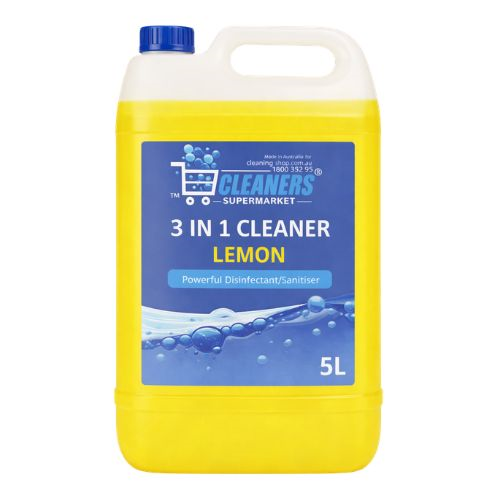 Cleaners Supermarket 3 IN 1 Cleaner Lemon 5L is a high-performance disinfectant, cleaner, and deodoriser formulated to deliver professional-grade results in a single step. This multi-purpose antibacterial solution effectively removes grime, kills germs, and eliminates odours, leaving surfaces clean and hygienically fresh with a zesty lemon scent. Ideal for use in homes, offices, schools, hospitals, and commercial spaces.