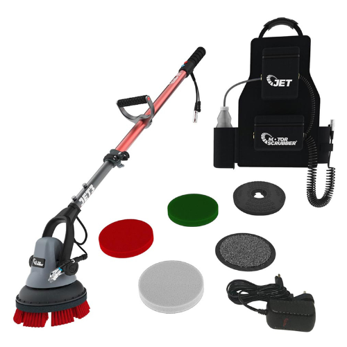 • The Cleanstar Motorscrubber JET3 Floor Scrubber is a compact, battery-powered cleaning system featuring on-demand spray technology for precise scrubbing and rinsing