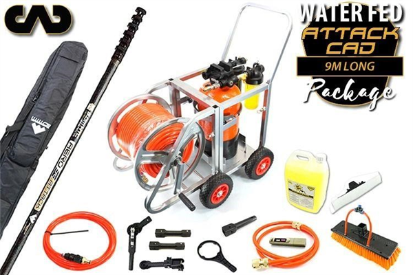 Includes BRILLIANT NEW 100% carbon, non-round Aero CAD Attack 9 m pole, 12.5 L GO H2O Pro DI on all-in-one trolley with detergent dispenser, removable compact hose reel & 80 m hose