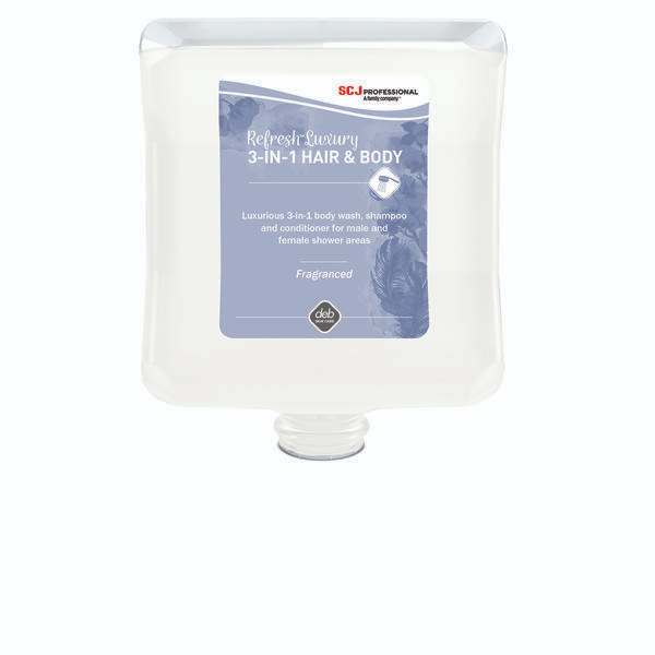 PRODUCT DESCRIPTION. Deb Refresh Luxury 3-in-1 Hair & Body Wash 2L 4/CTN is a premium unisex shower solution that combines body wash, shampoo, and conditioner in one convenient product. This high-quality creamy lotion produces a rich, luxurious lather that gently cleanses while leaving hair and skin smooth, soft, and conditioned after use. Its soap-free formulation is dermatologically designed for frequent use, making it gentle on the skin while maintaining effective cleansing performance. Supplied in cartons of 4 × 2L bottles, it provides a professional, cost-effective solution for facilities seeking quality and convenience