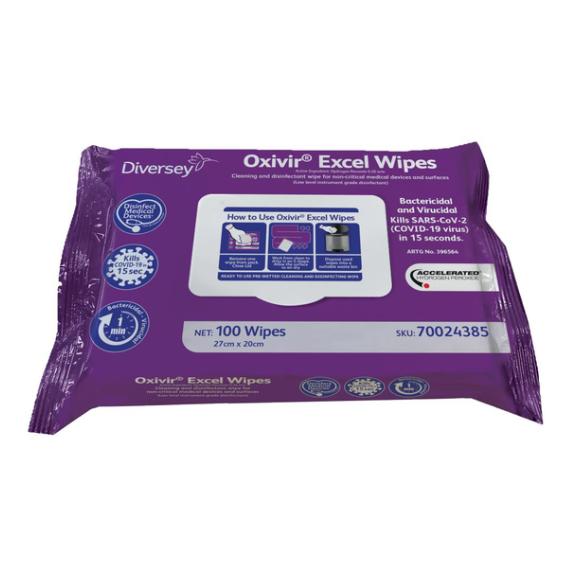 • The Diversey Oxivir Excel Wipes are ready-to-use hospital-grade disinfectant wipes based on Accelerated Hydrogen Peroxide technology, offering rapid, broad-spectrum cleaning and disinfection.