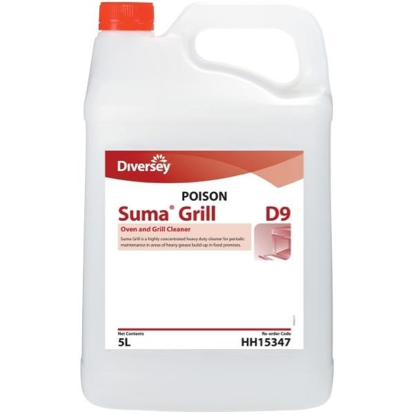 • Diversey Suma Grill D9 is a powerful alkaline cleaner formulated to remove heavy grease, carbonised deposits, and burnt-on food residues