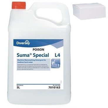 Diversey Suma Special L4 is a highly alkaline liquid detergent formulated for machine dishwashing in hard water conditions