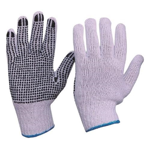 Knitted seamless polyester/cotton. Bleached for clean appearence. Ambidextrous. 7 gauge knit for strength & ventilation. PVC dots on one side for extra grip. Size: Large/X-Large. Quantity: 1 x Pair