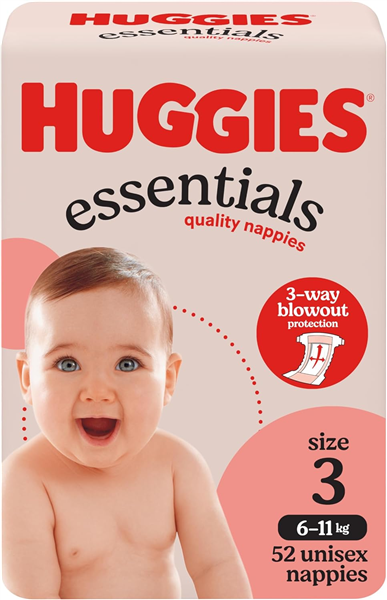 The Huggies Essentials Nappies is sure to keep your bub feeling comfortable and dry. This practical nappy allows for up to 12 hours absorbency and features a leak lock and a wetness indicator for convenience. Nappies suited bot both boys and girls. Suitable for 6-11kg. Size 3. Crawler Stage. Size: 52 nappies per pack. Quantity: 4 packs per carton