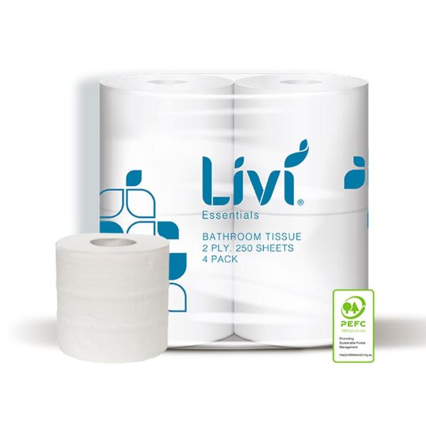 PRODUCT DESCRIPTION. Livi Toilet Tissue Essentials 2Ply 250 Sheet 4/Pk 12/CTN delivers the ideal combination of softness, strength, and absorbency, making it a high-quality yet value-for-money choice. Each roll contains 250 sheets of 2-ply tissue with dimensions of 100mm (W) x 105mm (L), providing comfort without sacrificing durability. Conveniently packed as 4 rolls per pack and 12 packs per carton, this bulk option is perfect for busy commercial or residential settings. Designed for everyday use, it’s an excellent choice for clubs, pubs, hotels, offices, and households