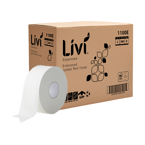 PRODUCT DESCRIPTION. Livi Toilet Tissue Essentials Jumbo 2Ply 300m is designed for high-traffic washrooms, offering exceptional convenience, comfort, and value. Each jumbo-sized roll measures 300 metres in length, reducing the frequency of refills and maintenance. Crafted with strong and absorbent 2-ply tissue, it provides reliable performance while the embossed texture adds extra softness for an improved user experience. With a width of 91mm, it fits standard jumbo roll dispensers, making it ideal for busy commercial environments. Supplied in a carton of 8 rolls, it’s perfect for ensuring a continuous supply in public and workplace facilities