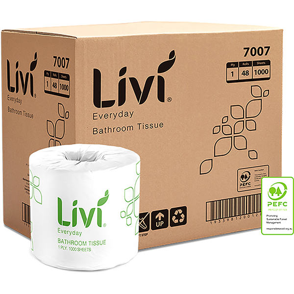 PRODUCT DESCRIPTION. Livi Toilet Tissue 1Ply 1000 Sheet 48/CTN offers exceptional value and long-lasting performance, making it ideal for high-traffic bathrooms. Each roll contains 1000 sheets (100m) of 1-ply toilet tissue made from 100% virgin grade fibres, ensuring strength and reliability. Individually wrapped for maximum hygiene, these rolls fit all standard roll holders and Livi dispensers. Neatly packaged and designed for everyday use, they provide a practical and cost-effective solution for commercial and residential settings. Roll dimensions: 99mm (W) x 100mm (L)