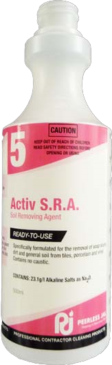 Empty 500ml spray bottle pre-printed with “Activ S.R.A.” label and equipped for use with Peerless Activ S.R.A