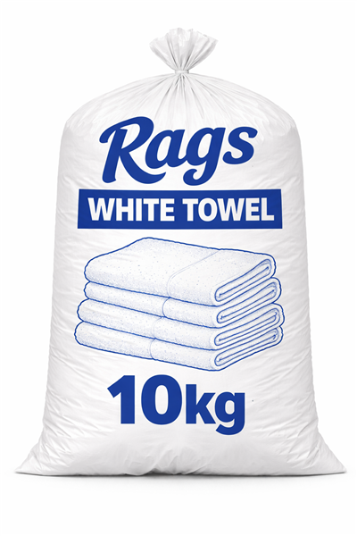 • The Rags White Towel 10kg bulk bag consists of cut-up white towelling material, ready-for-use as industrial wiping cloths.