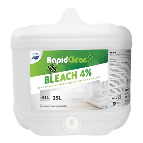 RapidClean Bleach 4% is a chlorine-activated bleach and disinfectant designed for general-purpose cleaning across housekeeping, laundry, kitchen, and washroom environments