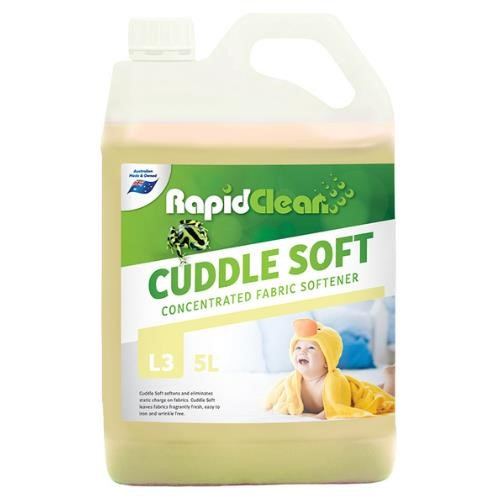 RapidClean Cuddle Soft Fabric Softener performs two roles in one operation softens fabrics as well as eliminating static charge. Cuddle Soft is used during the final rinse cycle after the laundering of towels and bed linen and to reduce the static cling in polyester and other synthetic garments. Cuddle Soft leaves fabrics fragrantly fresh, easy to iron and wrinkle free. Cuddle Soft can be used in both top and front loading washing machines. Cuddle Soft can also be employed in on premise laundries as found in motels, nursing homes, hospitals and hotels. Available in 5ltr and 15ltr