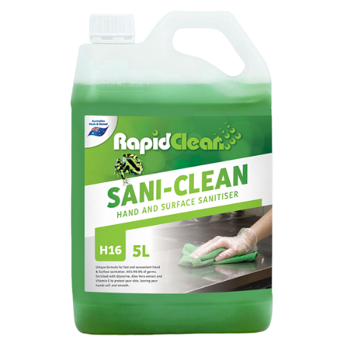 RapidClean Sani-Clean Hand and Surface Sanitiser 5L is a ready-to-use alcohol-based sanitiser formulated for fast and effective disinfection of hands and hard surfaces.