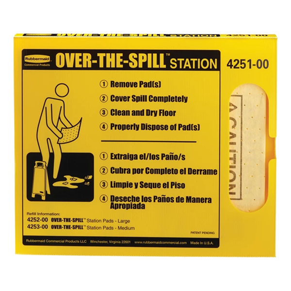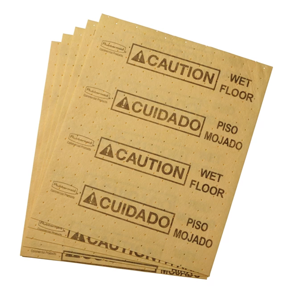Each yellow pad is coded with universal caution symbol and “Caution Wet Floor” message in English and Spanish