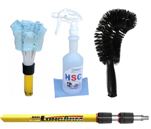 Includes a 5.4 m extension pole, 750 ml lens cleaning solution, a soft goat-hair dusting brush, and five premium microfibre cloths