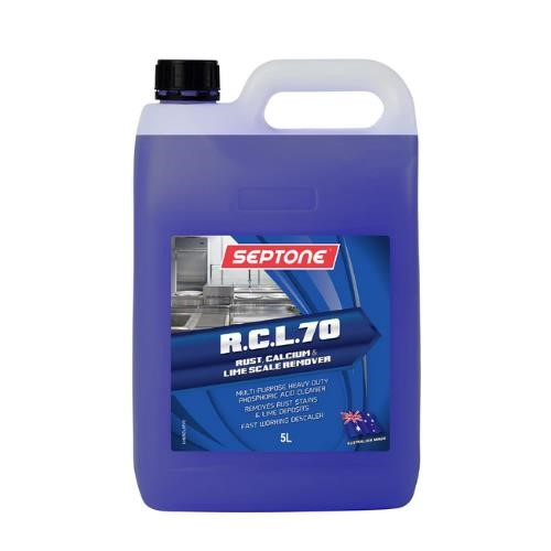 PRODUCT DESCRIPTION. Septone R.C.L. 70 is a powerful acid-based industrial cleaner designed to eliminate stubborn rust, scale, oxidation, and mineral deposits from a variety of surfaces including stainless steel, mild steel, copper, brass, ceramic, and glass. Formulated for heavy-duty commercial use, it delivers professional-grade cleaning performance in environments such as manufacturing plants, food processing facilities, automotive workshops, and marine settings. Its fast-acting formula restores metal and hard surfaces to a clean, bright, residue-free finish where ordinary cleaners are ineffective