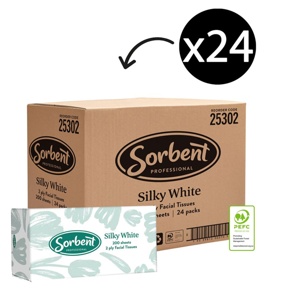 Sorbent Professional Silky White facial tissues are super soft to touch. Gentle and Sensative on the skin. Hypo-allergenic. Product Code: 25302. 2PLY. 200 Tissues Per Box. Quantity: 24 Boxes Per Carton