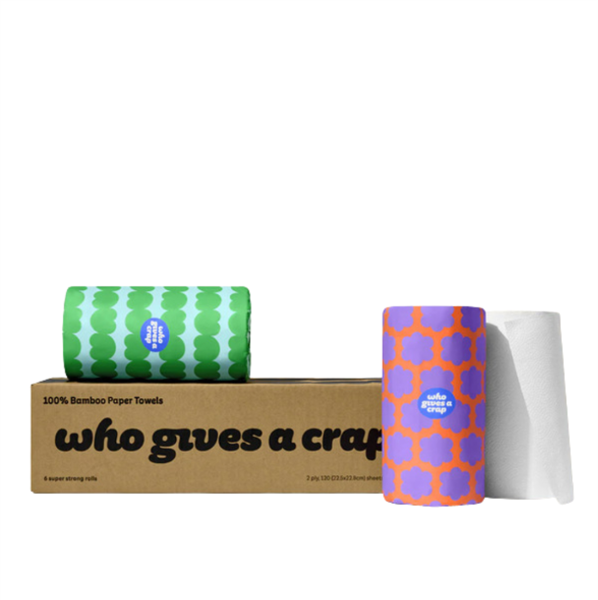 PRODUCT DESCRIPTION. Who Gives A Crap Kitchen Paper Towel 2Ply 120 Sheet 6/CTN is a sustainable and durable solution for everyday cleaning and drying. Each double-length roll features 120 extra-strong and absorbent 2 Ply sheets sized 22.8cm x 22.8cm, making it perfect for handling tough clean-ups in kitchens and workplaces. Made from a tree-free blend of bamboo and sugarcane, these eco-friendly towels are free from inks, dyes, and scents, offering a safe and natural choice for your household or business. Supplied in cartons of 6 rolls, they combine performance, value, and sustainability in one practical package
